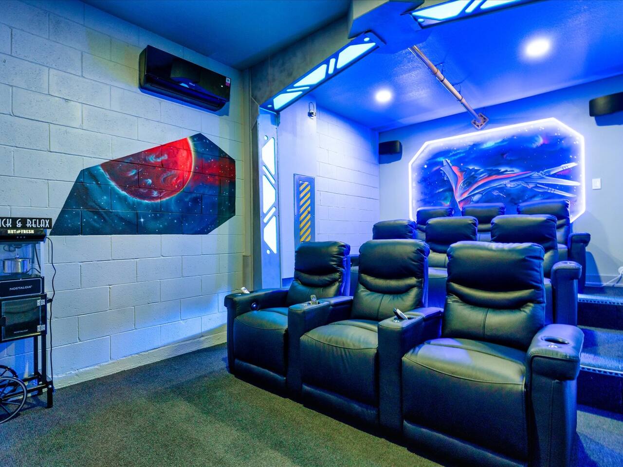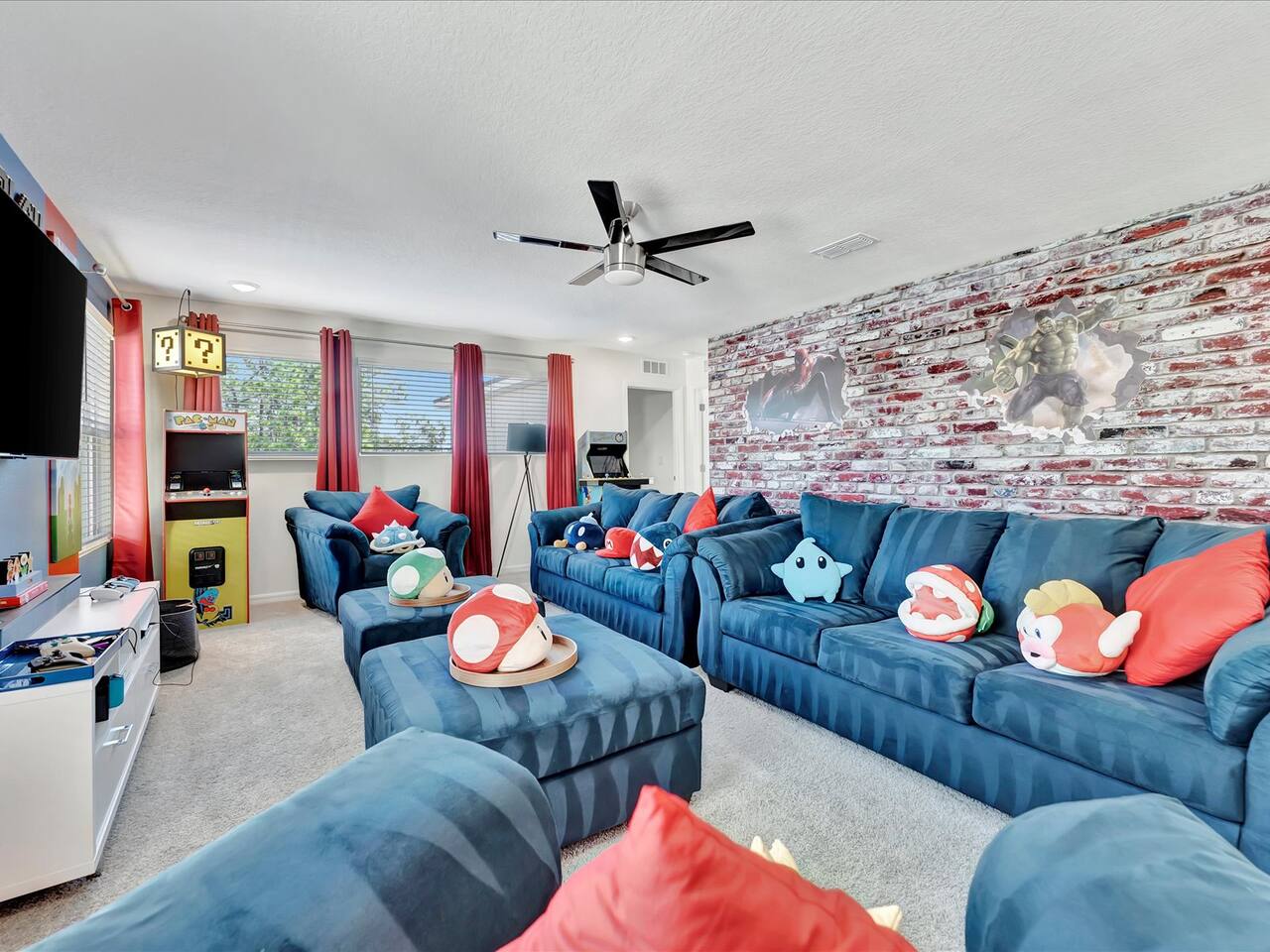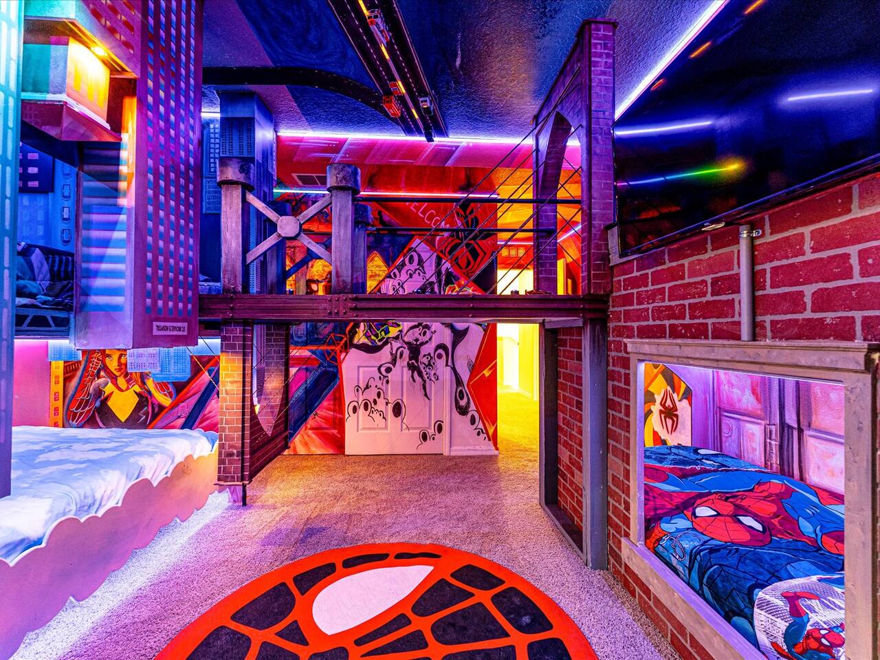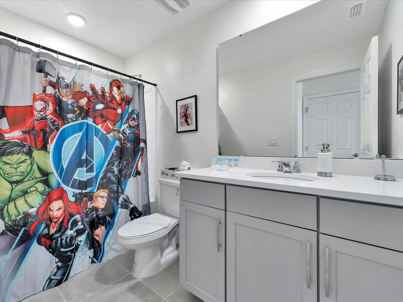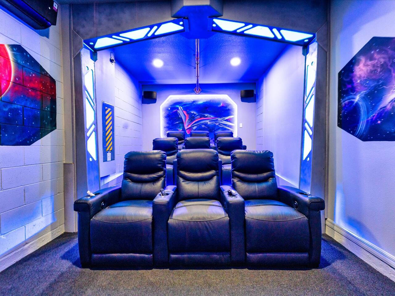 🛏️ Bedrooms: 3 King Suites with plush bedding and smart TVs 4 Themed bedrooms (Frozen & Star Wars) with twin beds and immersive decor. The amazing (SpiderVerse) with 1 Queen bunkbed and 1 twin bunkbed. The Encanto bedroom is a King Suite. 🍿 Entertainment: Private home theater with 120” screen, surround sound, and Guardians of the Galaxy ambiance Mario Game room with 2 large comfortable couches, 2 arcade machines, and console gaming plus board games. 🌴 Outdoor Oasis: Heated pool and spa with resort-style loungers Covered patio with dining area and grill 🏰 Resort Perks: Access to clubhouse, water park, gym, and playground ✨✨✨✨✨ Why Guests Love Us: “Our kids didn’t want to leave the SpiderVerse room!” “The theater was better than going to the movies.” “Everything was spotless, themed, and magical.” 🚫 No pets due to severe allergies 🧼 Starter toiletries provided, please bring extras ⭐ Add us to your Wishlist Book now and create unforgettable memories in a home that feels like a theme park with the comfort of a luxury retreat.