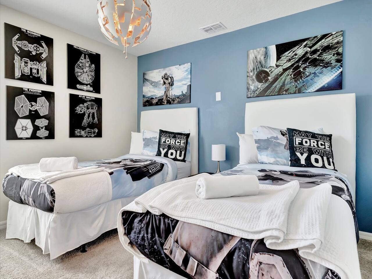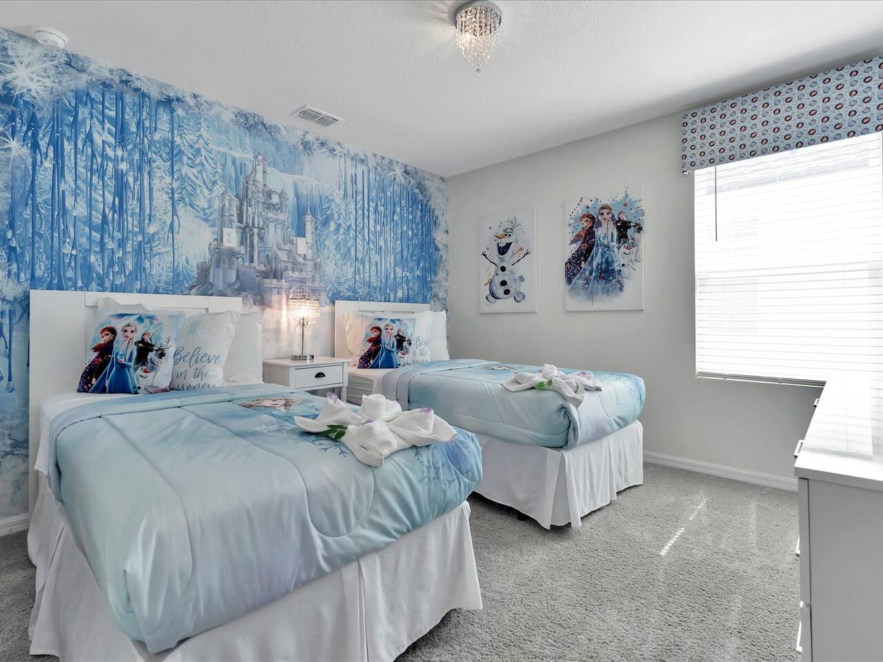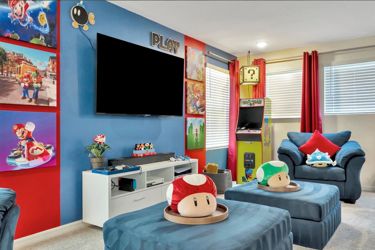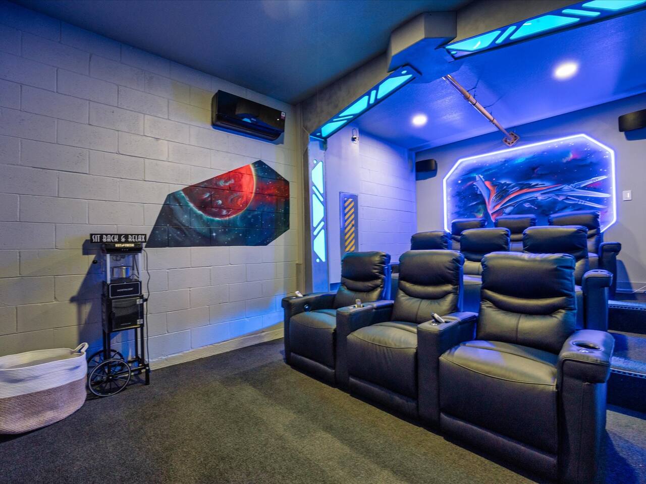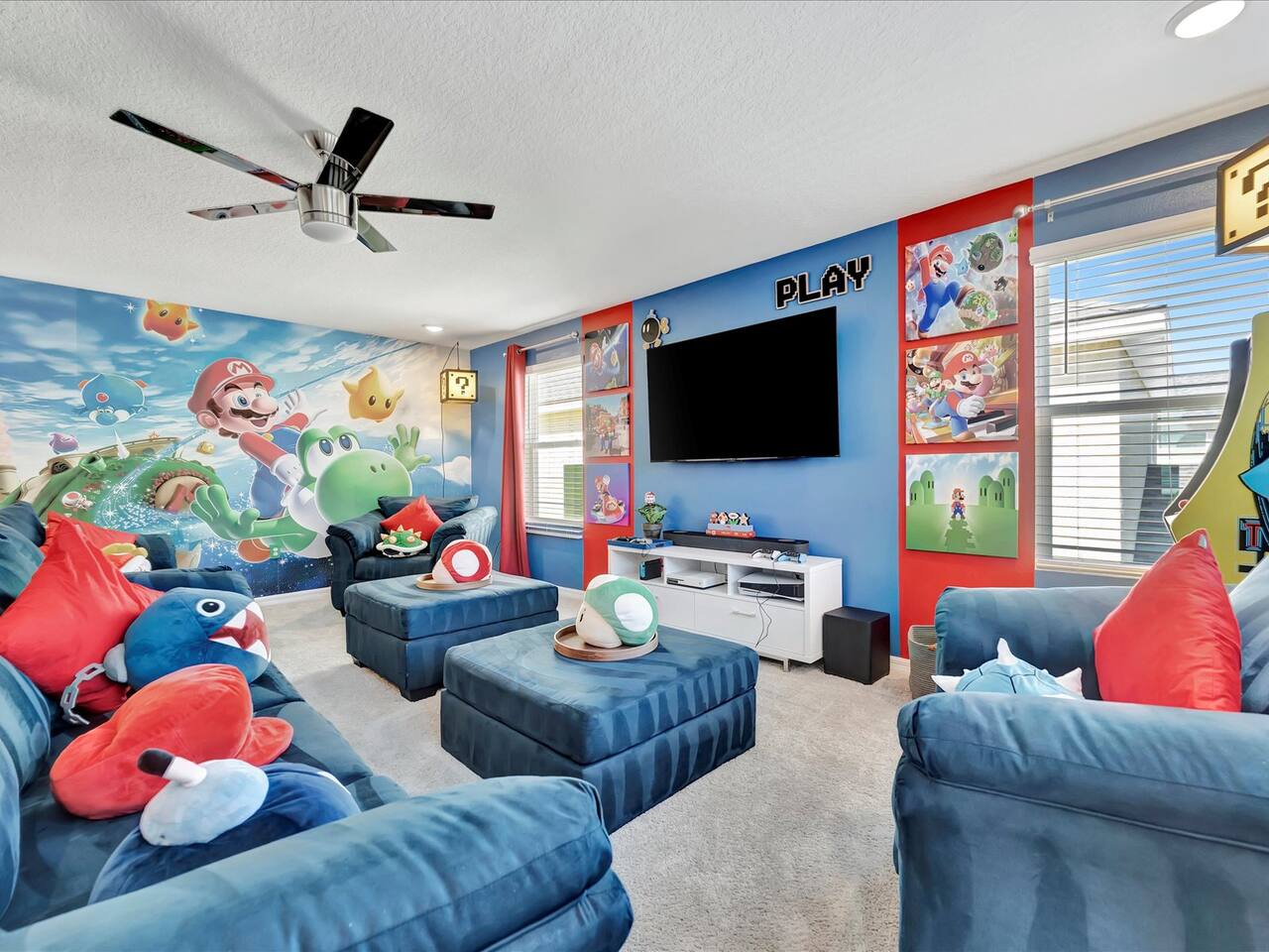 🛏️ Bedrooms: 3 King Suites with plush bedding and smart TVs 4 Themed bedrooms (Frozen & Star Wars) with twin beds and immersive decor. The amazing (SpiderVerse) with 1 Queen bunkbed and 1 twin bunkbed. The Encanto bedroom is a King Suite. 🍿 Entertainment: Private home theater with 120” screen, surround sound, and Guardians of the Galaxy ambiance Mario Game room with 2 large comfortable couches, 2 arcade machines, and console gaming plus board games. 🌴 Outdoor Oasis: Heated pool and spa with resort-style loungers Covered patio with dining area and grill 🏰 Resort Perks: Access to clubhouse, water park, gym, and playground ✨✨✨✨✨ Why Guests Love Us: “Our kids didn’t want to leave the SpiderVerse room!” “The theater was better than going to the movies.” “Everything was spotless, themed, and magical.” 🚫 No pets due to severe allergies 🧼 Starter toiletries provided, please bring extras ⭐ Add us to your Wishlist Book now and create unforgettable memories in a home that feels like a theme park with the comfort of a luxury retreat.