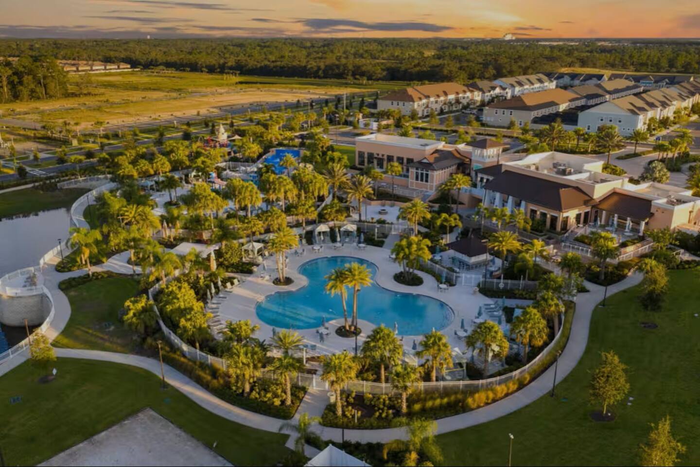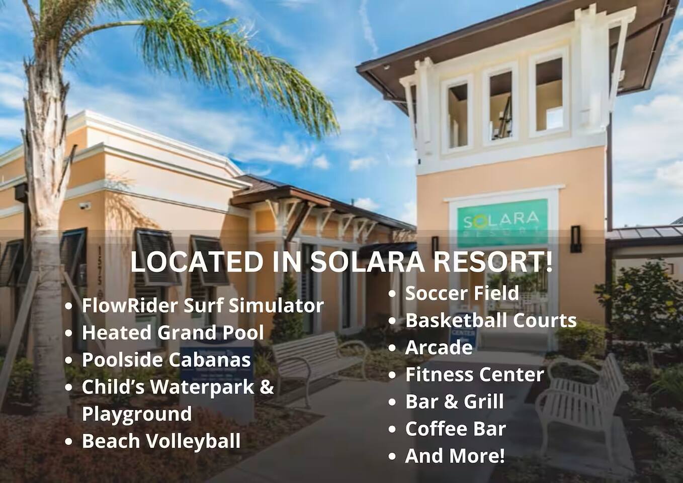Solara Resort is a luxury vacation rental community that offers a variety of amenities and services for its guests and residents. Enjoy the water park, which features a heated pool, a splash pad, water surfing simulator and cabanas. You can cool off in the water, have fun with your family and friends, or just relax in the sun. Access the clubhouse, which has a restaurant, a bar, a coffee shop, a sundries store. You can dine in style, have a drink, grab a snack, shop for essentials, or get help with your travel plans. Work-out at the fitness center, which has state-of-the-art equipment, a yoga room, and personal trainers. You can stay fit and healthy, practice yoga, or get some guidance from the experts. Play at the recreation park, which has a soccer field, a basketball court, a volleyball court, a playground, and a picnic area. You can enjoy some sports, have fun with your kids, or have a picnic with your loved ones.